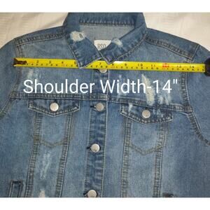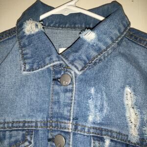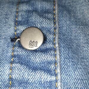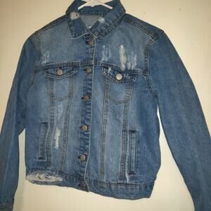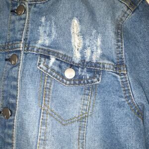 Previously Owned RSQ Denim Jean Jacket. Buttons up the front. Has 4 pockets, 2 are button and 2 are slit pockets. Long Sleeved with buttons at wrists. Very distressed Medium wash.