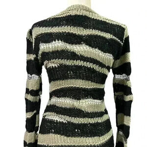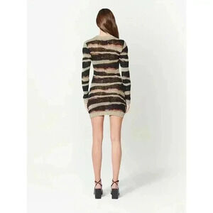"Sporting a monochromatic stripe pattern throughout, this silk blend dress from RtA offers an openwork knit design for a semi-sheer finish."