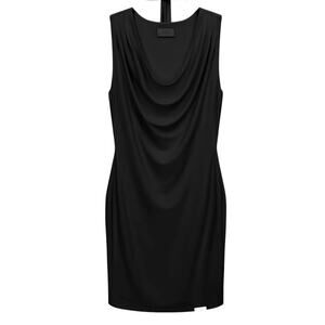 The RtA Alyse Draped Mini Dress in black is a stylish and versatile piece perfect for various occasions. This sleeveless dress features a cowl neck and a pullover closure, making it easy to wear. Made from a stretchy polyester and spandex blend, this bodycon dress is comfortable and flattering. The short dress length and solid black color make it suitable for parties, travel, or casual wear. Add a touch of whimsy or goth style with this designer piece that embodies a mix of rock, punk, and sexy themes.