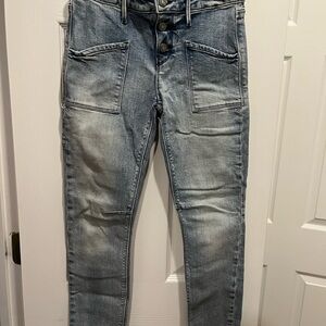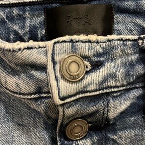 Stylish blue denim jeans by RtA. Features classic button closure. Perfect for everyday wear.