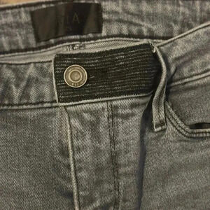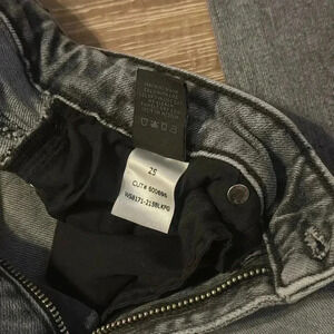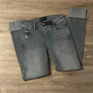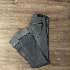 Dark gray jeans with a faded look, slim fit, and cuffed legs for a modern casual style.