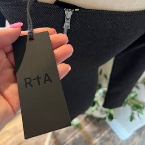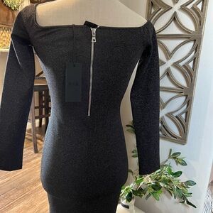 RtA "Electra" metallic dress with button details. Off-the-shoulder neckline. Long sleeves. Body-conscious silhouette. Slit front hem. Mini length. Size 0