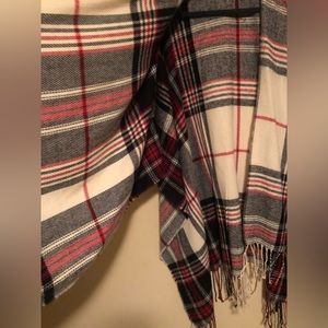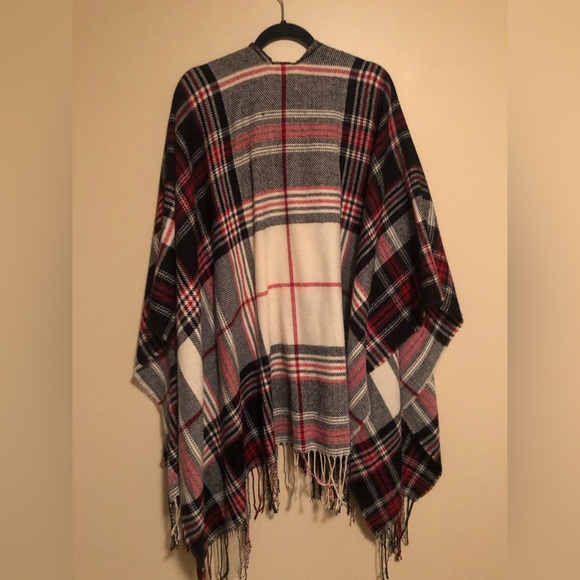 Versatile piece with this plaid black tan and red Ruana. Easy to throw on and very fashionable.