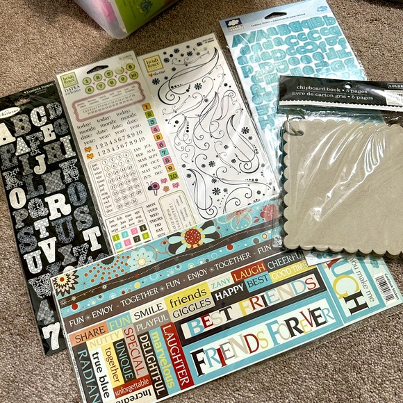 Scrapbooking supplies, stickers and planner rub ons. Also cardboard chipboard with metal ring. 5 pages.