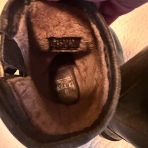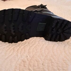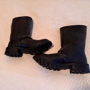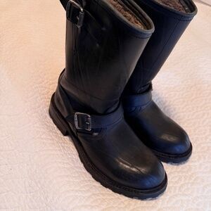 The Frye Shearling-Lined Rubber Engineered Black Men's boots are handcrafted, featuring a durable rubber upper, Goodyear welt, a solid black color and a biker style, these boots are perfect for the winter, fall, and spring seasons. Made by the renowned brand Frye, these boots offer both style and comfort for the modern man.