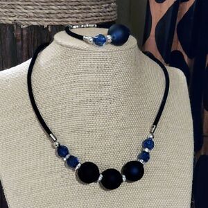 Made with dark blue rubber coated vintage beads, faceted blue acrylic beads, rhinestone rondelles, and black velveteen cord