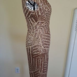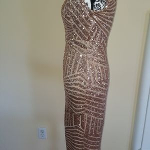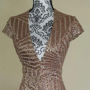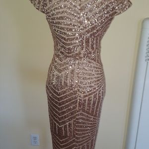 It has never been worn, size Small. It has form fitting stretch so your curves will be hugged beautifully in this show stopper. Classy and sexy wrapped in one bronzy gold package! This dress works in any season and is an absolute gem.