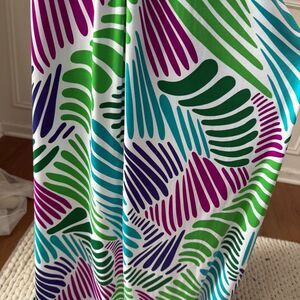 Rubber Ducky is a contemporary women's fashion brand that aims for clean lines, excellent one-of-a-kind prints, and flattering shapes. This stretchy jersey maxi dress has a bold modern and vaguely tropical, print and green, blue, violet, and purple with a structured U shape top. Back zip closure. Empire waste and Column style. laying flat measures approximately 15 inches armpit to armpit 19 inches straight across the waist and 23 inches across the hip. 95% polyester and 5% spandex, so lots of “give”. Made in the USA.