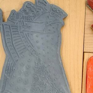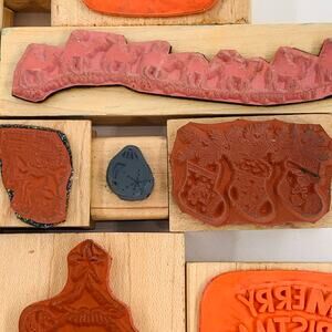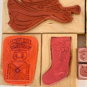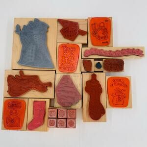 Rubber Stamp Lot of 20 features Christmas-themed designs, including snowmen, trees, wisemen, stockings, angels, and reindeer. Sizes range from 5" to 0.75", with a 5.75" border stamp included. All stamps are used but in good condition, with well-preserved rubber. This lot includes a variety of brands, offering a versatile selection for crafting, scrapbooking, or card-making projects. A perfect Christmas or birthday gift for the crafter in your life.
