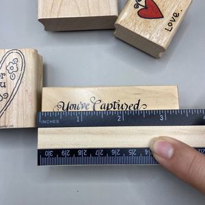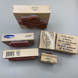 Included in this lot are 6 romance themed wood mounted rubber stamps of various sizes, dates, and manufacturers. Details shown in photos. All are in lightly used or unused condition; please see photos for reference. Will come in clear plastic clam shell case.