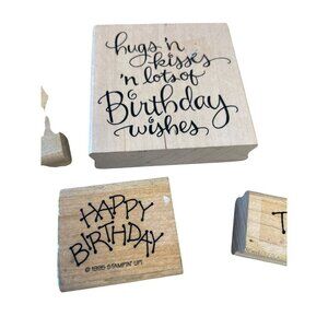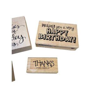 These wood-mounted rubber stamps feature versatile designs for birthdays and thank-you notes. Durable construction ensures clean impressions for crafting and card-making.