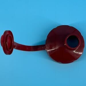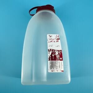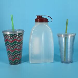 Two quart Rubbermaid drink pitcher with maroon lid and two plastic cups with lids and straws. The blue tint is from the background. Due to light & screen variations, colors may vary slightly from the images