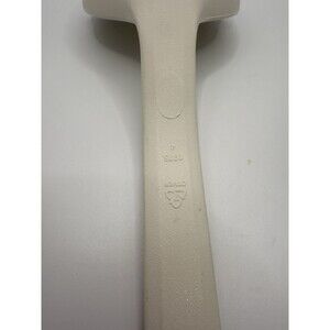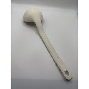 The Rubbermaid White Ladle Server Spoon #1975 #1 is a vintage kitchen utensil designed for serving and eating. Made of durable plastic, this 12.5" long ladle features a white color and a plastic handle for easy grip. Perfect for cooking and serving meals in the kitchen, this single ladle server spoon is a practical and reliable addition to any home cook's tools. SMOKE FREE HOME