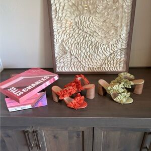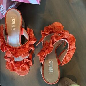 Step into style with these red mules, featuring elegant ruffled straps and a comfortable block heel. Perfect for making a statement at any summer event, these slip-on shoes combine fashion and function effortlessly. The vibrant color and unique design ensure you'll stand out in any crowd.