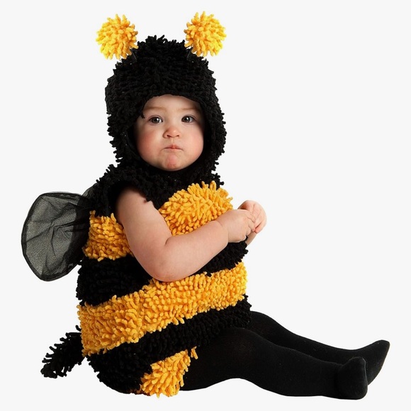 Adorable bumblebee costume by Rubie's. Features black and yellow stripes. Includes hood with antennae and wings. And two bee suits