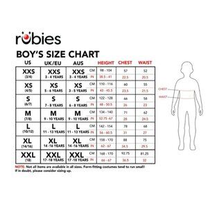- IMPORTANT: Costume sizes are different from clothing sizes; review the Rubie's size chart image when selecting a size and consider buying the next size up if you are at the top of a size range. Measurements are shown in the listing.