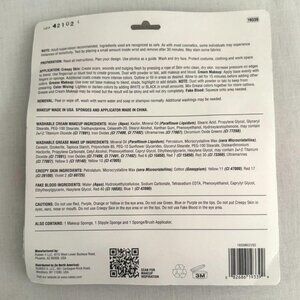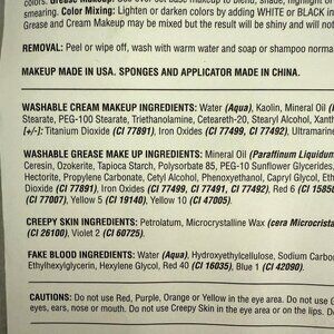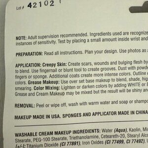 • Net Wt: Grease Makeup 0.5 oz (14g), Cream Makeup 1.2 oz (34 g) Creepy Skin 0.25 oz (7 g), Fake Blood Net: 1 fl oz (29.5 mL)