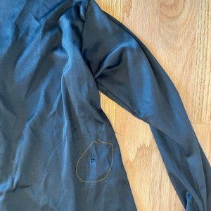 Pullover dress has long, hanging sleeves, foam-backed stand-up collar