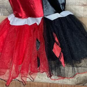 Rubie's Harley Quinn Tutu Dress Costume. Size medium. Elastic waist. Velcro back closure. Flutter sleeves. Excellent condition, but the red has slightly rubbed off in a few areas. See pics.