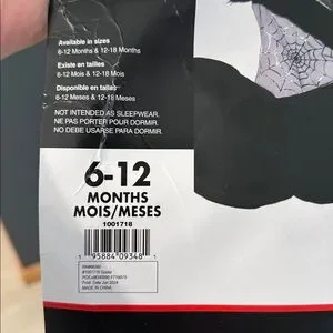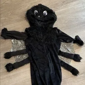 Soft black faux fur jumpsuit with hood. Attached furry sleeves and shoe covers. Adorable spider-themed outfit for infants. Easy to slip on for dress-up.