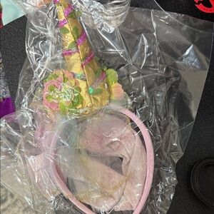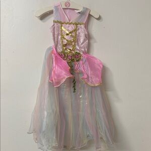 Charming fairy costume with shimmering pink and gold bodice. Features a flowing skirt with pastel hues.