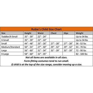 IMPORTANT: Costumes are sized differently than apparel, use the Rubie’s Child Size Chart, do not choose based on child’s age or clothing size
