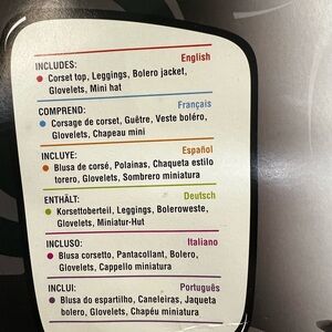 Bold striped costume with jacket and corset. Includes matching leggings and gloves. Ideal for Halloween.