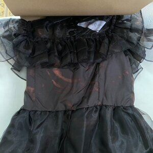This ruffled dress is made with beautiful sheer black fabric and features a back zipper closure. The belt has a decorative buckle and is secured with a simple hook-and-loop closure.