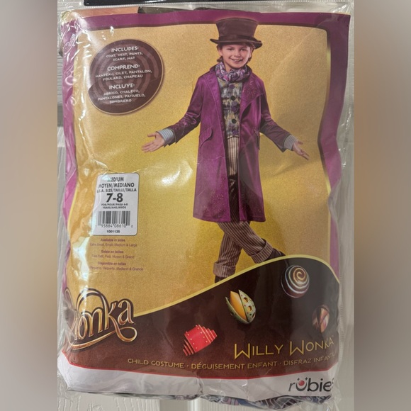 Dress up as Willy Wonka with this vibrant costume. Includes purple coat and brown hat. Ideal for Halloween fun. Worn 1x and has been washed