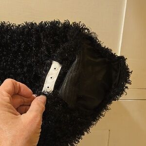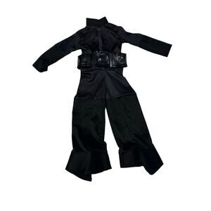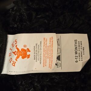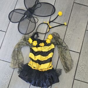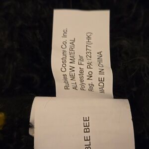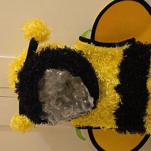 This precious little bumble bee costume is made of fluffy, curly material and is lined in satiny fabric. The front has a padded belly for body. The closure, wing attachment, and chin strap are velcroed. The crotch has 3 plastic snaps. Bee adorable!! ๐