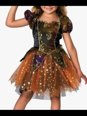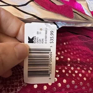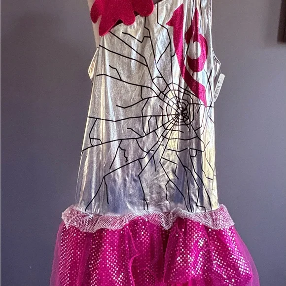 Shiny silver bodice with black spiderweb print. Bright pink accents and glitter tulle skirt. Sleeveless party dress with playful layered skirt. Bold graphic detail for dress-up fun.