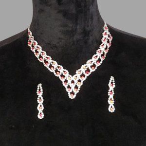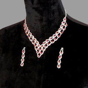 Ruby accent, v-neck, choker set. Sparkling, double layer, ruby accents embeaded in this goregous silver chain. Earrings drop about 1.5 inches. Look dazzling in this set for your prom, wedding party attire, anniversary, hot date or any special occassion.