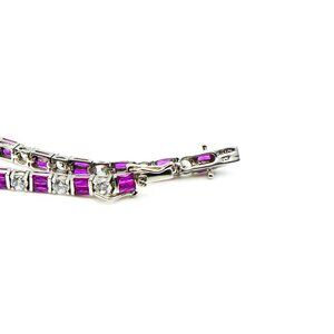 Ruby And CZ 7.9-Inch Tennis Bracelet in Rhodium Plated Sterling Silver. This stunning Sterling Silver bracelet features lab created square cut red Rubies and princess cut clear Cubic Zirconias set in a classic Sterling Silver Tennis Bracelet style with Rhodium plating for long lasting shine. This bracelet makes a wonderful gift for anniversaries, graduation or weddings. A ruby signifies love and passion. It is also said to attract good luck. Ruby is also the Birthstone for July.