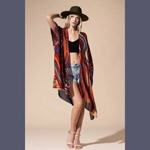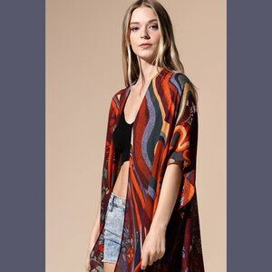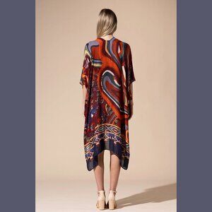 Indulge in a blast from the past with our Ruby Chic Retro Kimono. Made from 100% Viscose, this lightweight and stylish piece adds a distinctive flair to any ensemble. Its unique blend of rich colors and patterns will transport you to past eras, making a statement wherever you go.