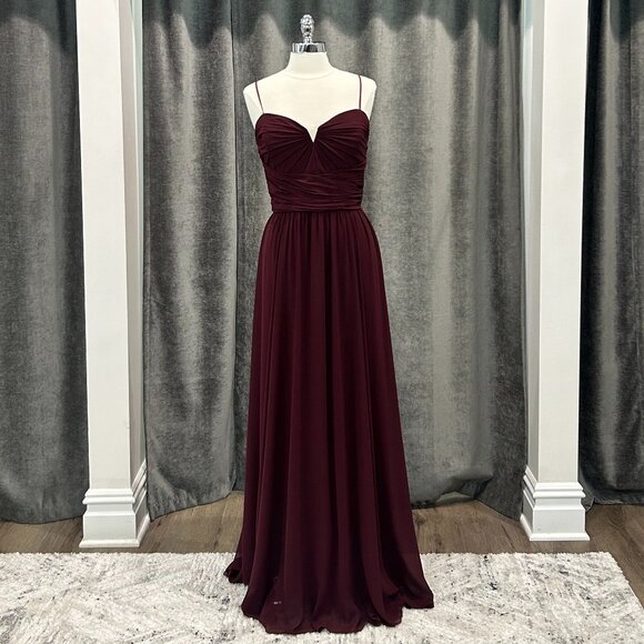 Spaghetti strap bridesmaids dress with ruched notched and wide waist bodice in flat chiffon.