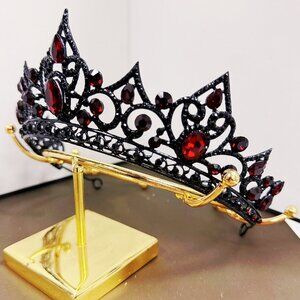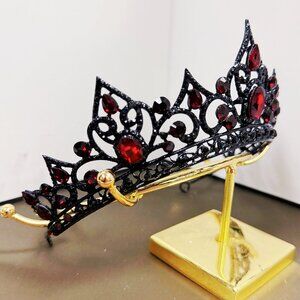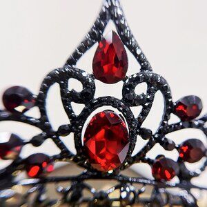 The Ruby Crystal Tiara is a handmade piece designed with black and red elements, perfect for a Gothic or cosplay theme. Made with crystal, rhinestone, and gemstone materials, this tiara adds a touch of luxury and glam to any special occasion like Halloween, parties, or formal events. Its unique style and attention to detail make it a standout accessory for those looking to make a statement with their attire. Made in the United States, this tiara combines quality craftsmanship with a bold and eye-catching design.