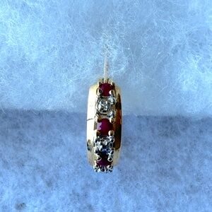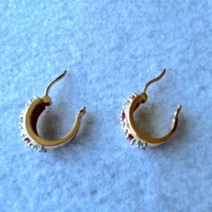 Ruby and clear pavé cubic zirconia set in gold plated 925 silver. Hinged post. Approximately 5/8-inch in diameter.