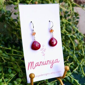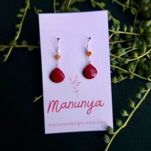 Ruby Drops: Deep, rich rubies discovered in a coastal bead shop, offering an unforgettable touch of elegance. Please note, the hole in one of the rubies on the carnelian (orange) option is unevenly drilled (see close-up in photos), but the earrings are fully wearable and just as beautiful! This can happen when working with natural materials.