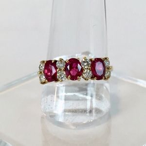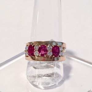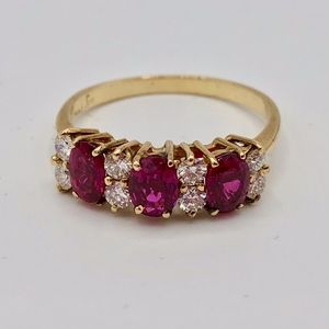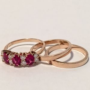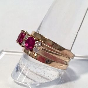 Vintage Ruby & Diamond 14k yellow gold ring w/ 2 bands. Size 7.75. Prong set w/ 3 oval faceted rubies approx 5x4mm 1.41 carats total, clarity Type II eye-clean, color R 5/5 medium strong red, finish polished w/ 8 round brilliant diamonds 0.059 cts. each, total est. wt. 0.40 carat. SI-1 to I-1 clarity (1 diamond is chipped); H to I color. 1.68 pennyweight. 2 14 k yellow gold bands 2.77 total pennyweight. All size 7.75. Ruby ring sizable. Rubies have nicks & a scratch on one. Nicks on gold from typical wear. Ruby ring appraised 2021 $6600. Gold bands appraised 2015 $300 each. Offers welcome.