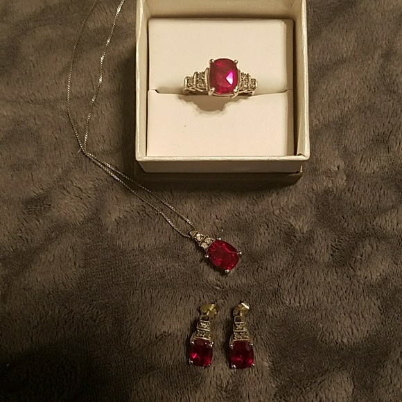 These are Lab created Rubies w/ small real diamond accents, set in Sterling silver. This set contains a pair of earrings, 18" necklace and size 7 1/2 ring, all set in 925 Sterling silver (stamps on each piece)