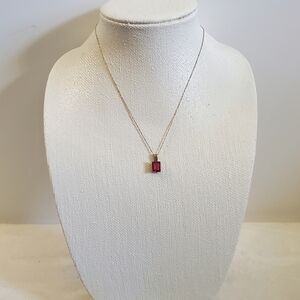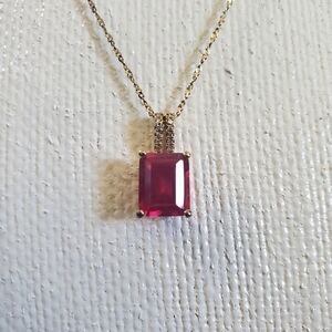 Lab Created Ruby Stone Diamond Accent 14K Gold Over Silver Pendant Necklace. Timeless beauty gemstones! 14K gold plating, sterling silver metal, spring-ring clasp & 18" chain length. 0.63" pendant length, emerald cut, lab-created ruby, prong setting & 4 1/5 ruby carat weight. Round diamond shapes, I-J color grade, 12-13 clarity, prong setting & less than 1/10 carat total weight. Like new condition!