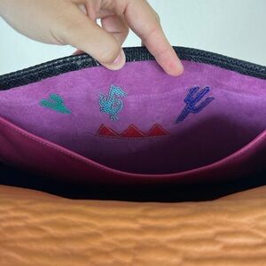 Beautiful large saddle bag with croc embossed leather and a beautiful big detailed silver buckle. Inside has 2 vibrant pink pockets with fun colorful leather patch designs. Made in Tucson, AZ. Offers welcome!