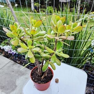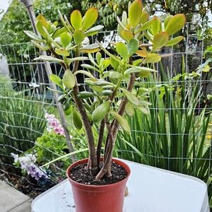 A stunning selected form of Crassula ovata, prized for its compact growth and unique ruby-red blushed leaves. The tear or wedge shaped foliage ranges from jade green to yellow-green, often developing rich red tones along the edges, especially when exposed to bright light and slightly dry conditions.
