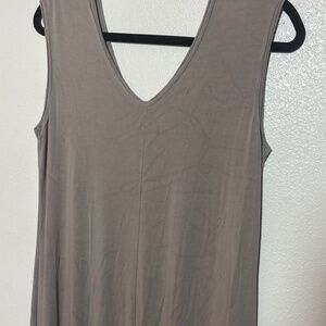 Elevate your everyday style with this minimalist Ruby Jane sleeveless maxi dress in a versatile taupe color. Made in the USA from a soft, stretchy rayon-spandex blend (95% rayon, 5% spandex), this flowy V-neck long dress is both comfy and flattering. Perfect for layering or wearing solo in warm weather.