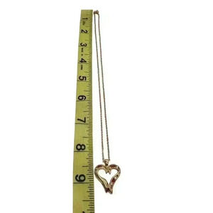 A beautiful heart-shaped pendant features an open center and is accented with lab created ruby and CZ set in 14K gold electroplate. Chain is also 14k gold electroplate.