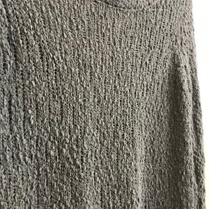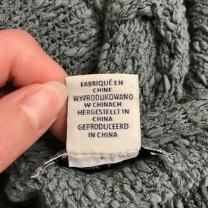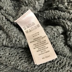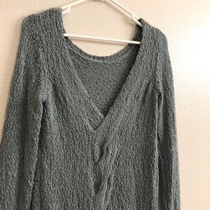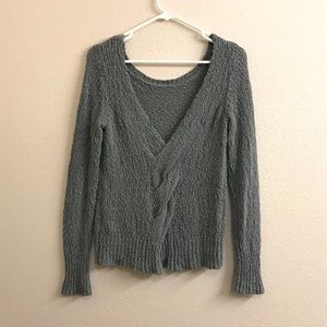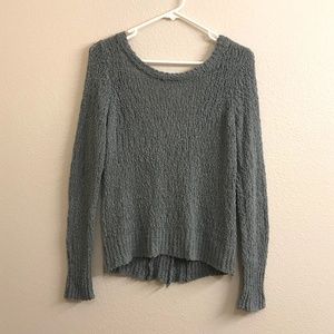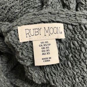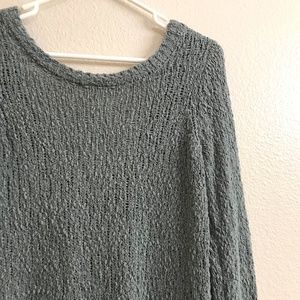 In like new condition. Open back neck with braided back. Beautiful open knit fabric in a slate teal color. Definitely more a gray/green with a bit of blue, like teal. Brand is Ruby Moon - purchased from a local boutique similar to Free People. Sweater is not see through. Would be cute with a strappy bralette to show in the back! Can also be worn front or back, 2 different wear options.