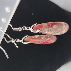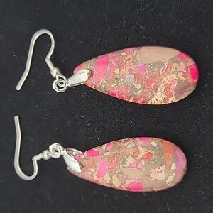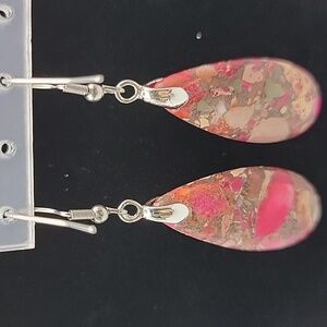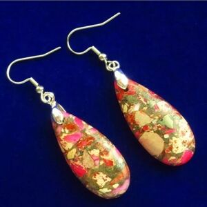 Elegant teardrop sea sediment Jasper earrings. Featuring a stunning multi color and silver tone design. 2" drop. Perfect for adding a touch of color to any outfit.