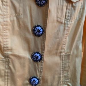 NOTE👉Jacket has some spots (see photos). I haven’t washed to try to get out (one is very small next to last button easy to hide if jacket buttoned up..other is on sleeves, still very cute jacket! Buttons are white beaded with antique gold or darker color around outside-snap together. This is cotton thou it gives a jean look it’s a soft cotton.