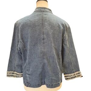 This stylish Ruby Rd. denim jacket has ruffle details , frayed cuffs and hook & eye closures. The 3/4 sleeves make it perfect for layering or showing off a cute top underneath. It's made from a comfy and stretchy blend of ramie, cotton, polyester, and spandex.