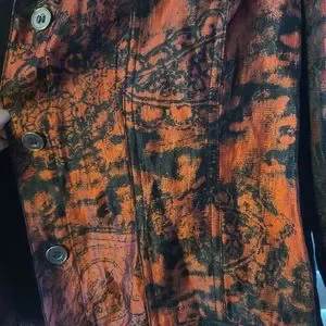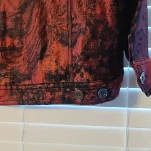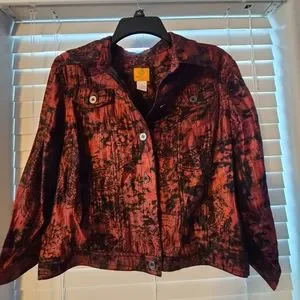 Shimmery black/ red thin jacket size 14P. Vguc. Underarm to underarm 21" Back collar to hem 22"